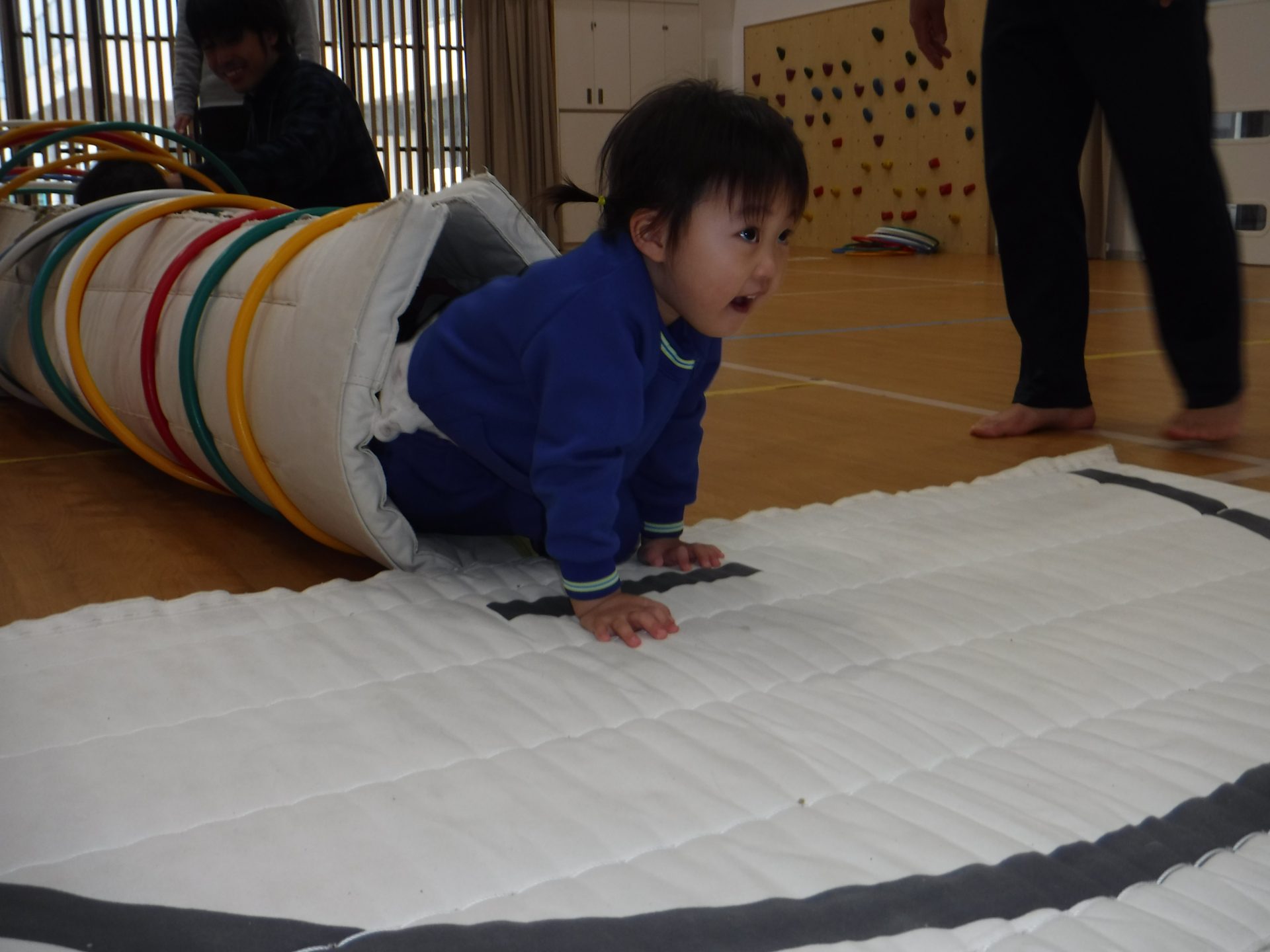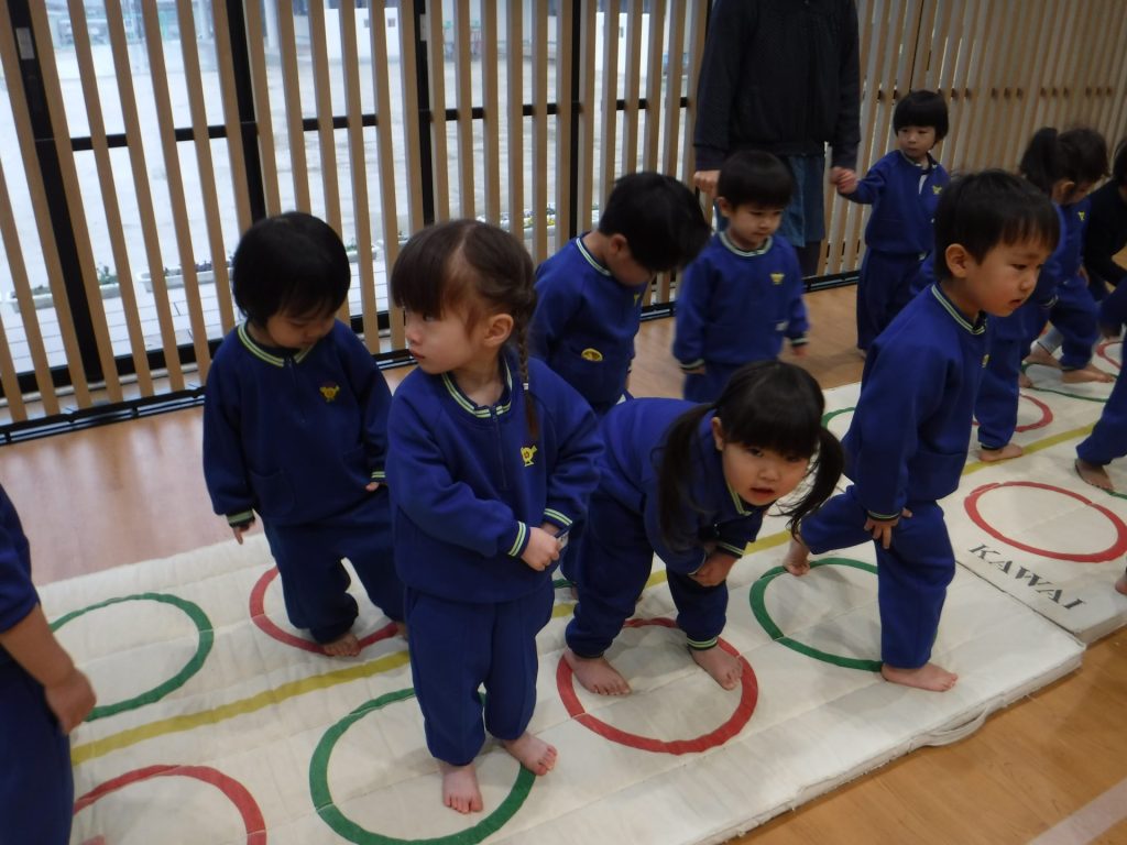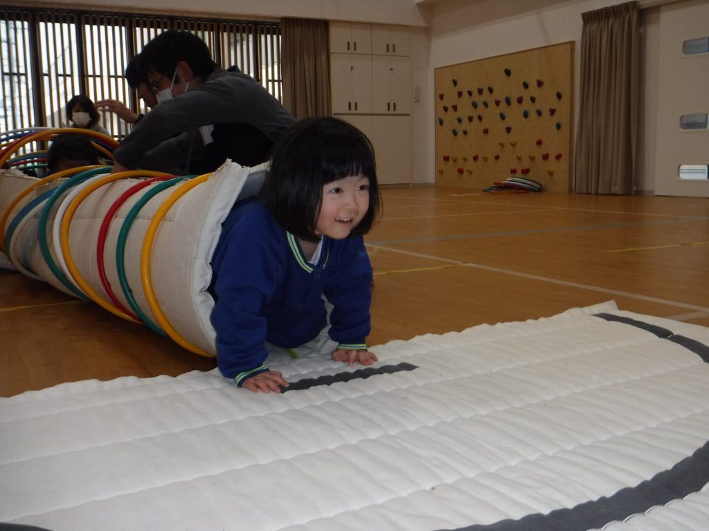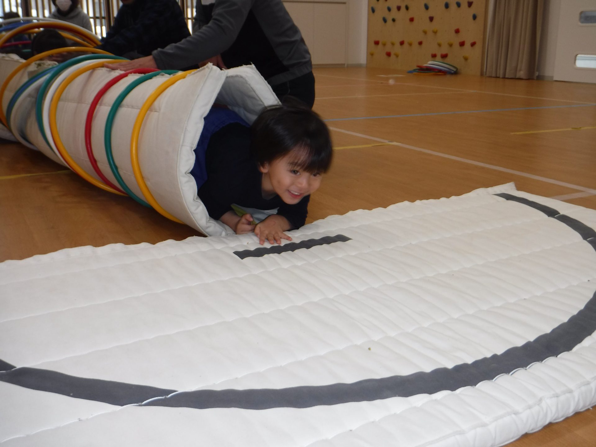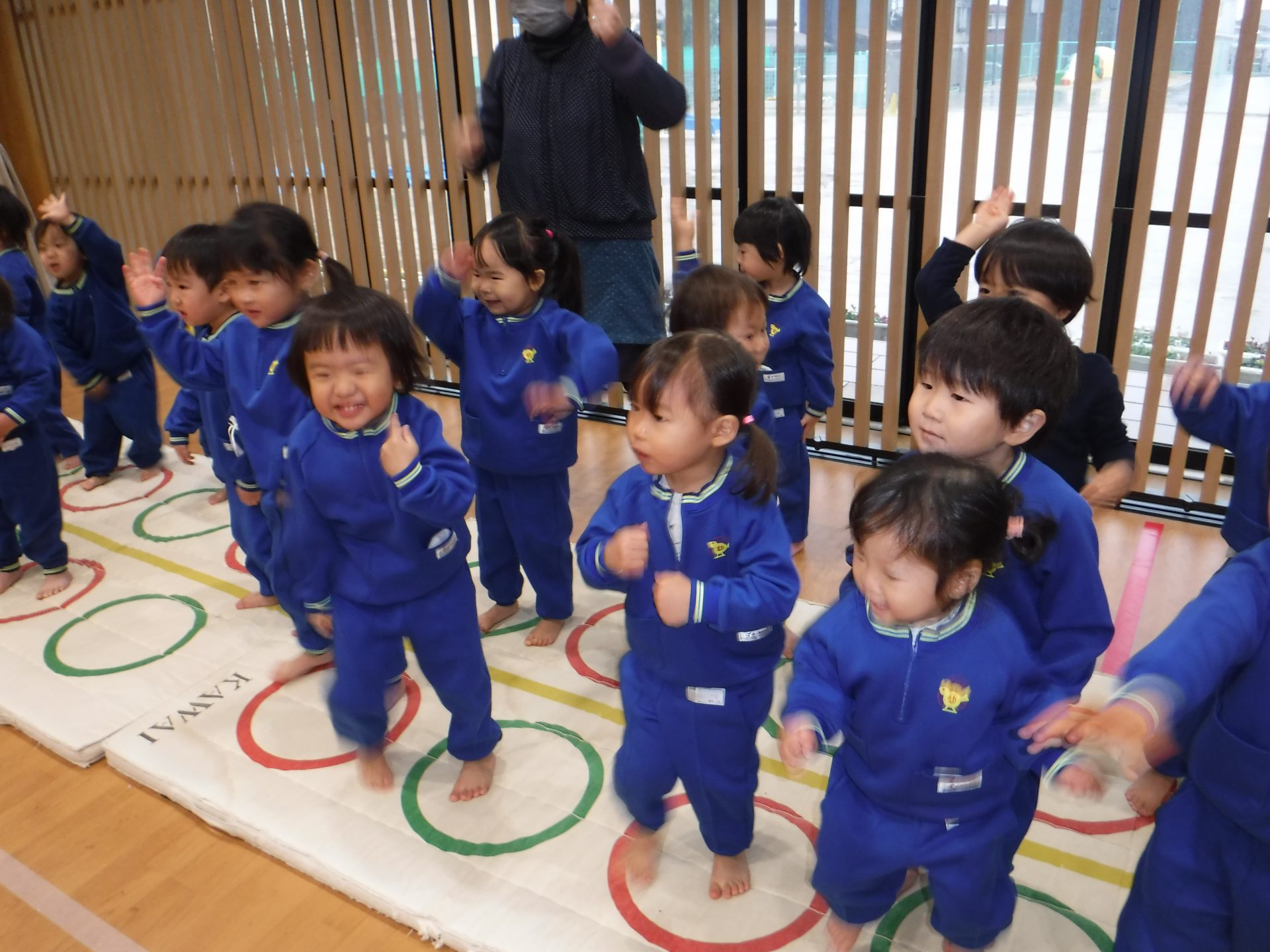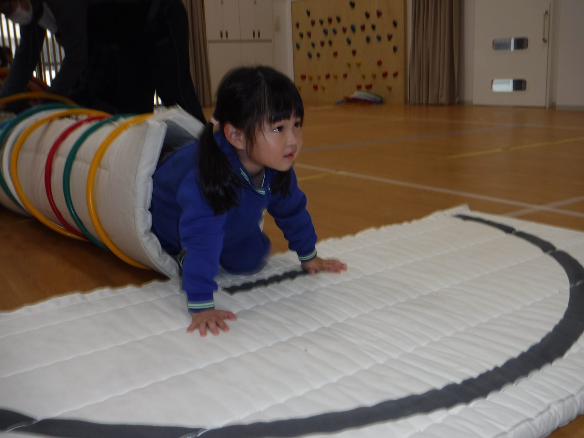 一人一つフープをもらい、回したり転がしたり、自由に遊びます。