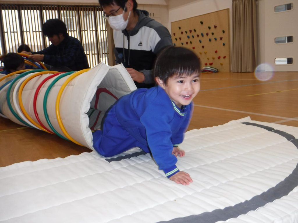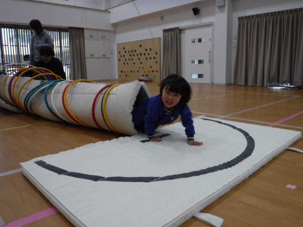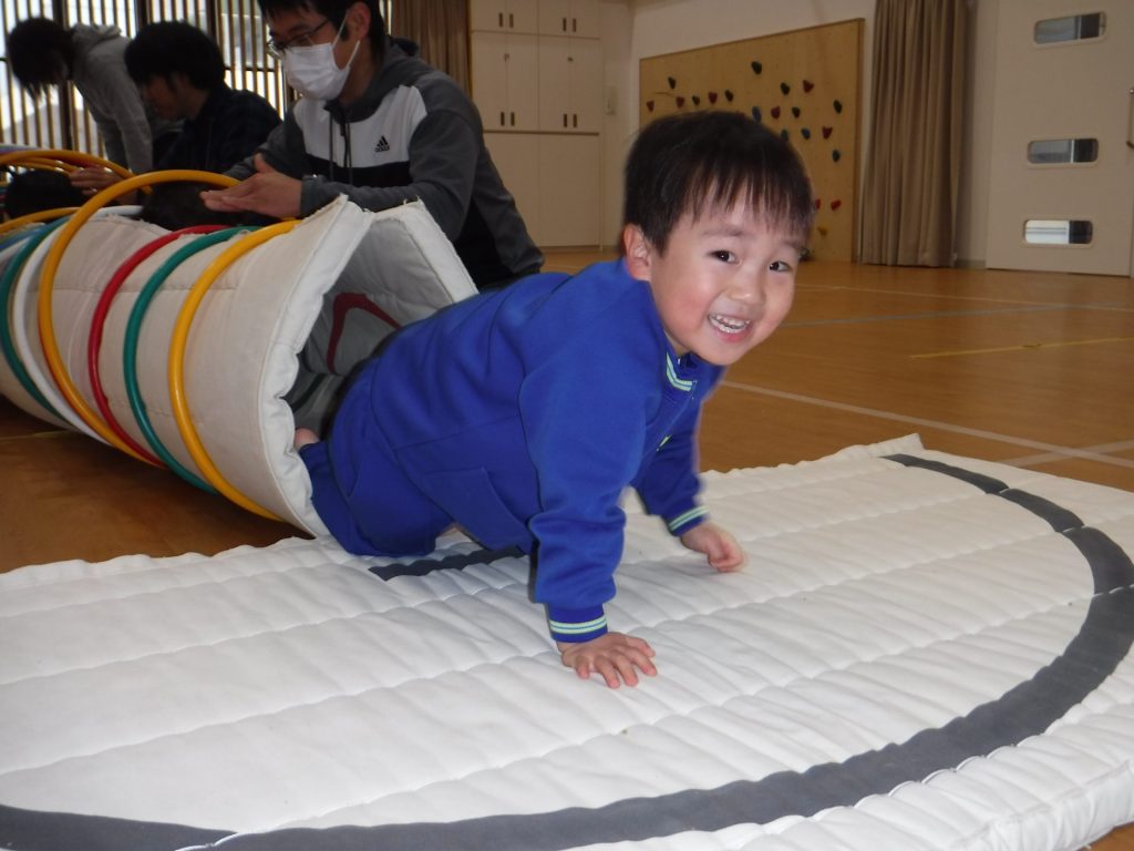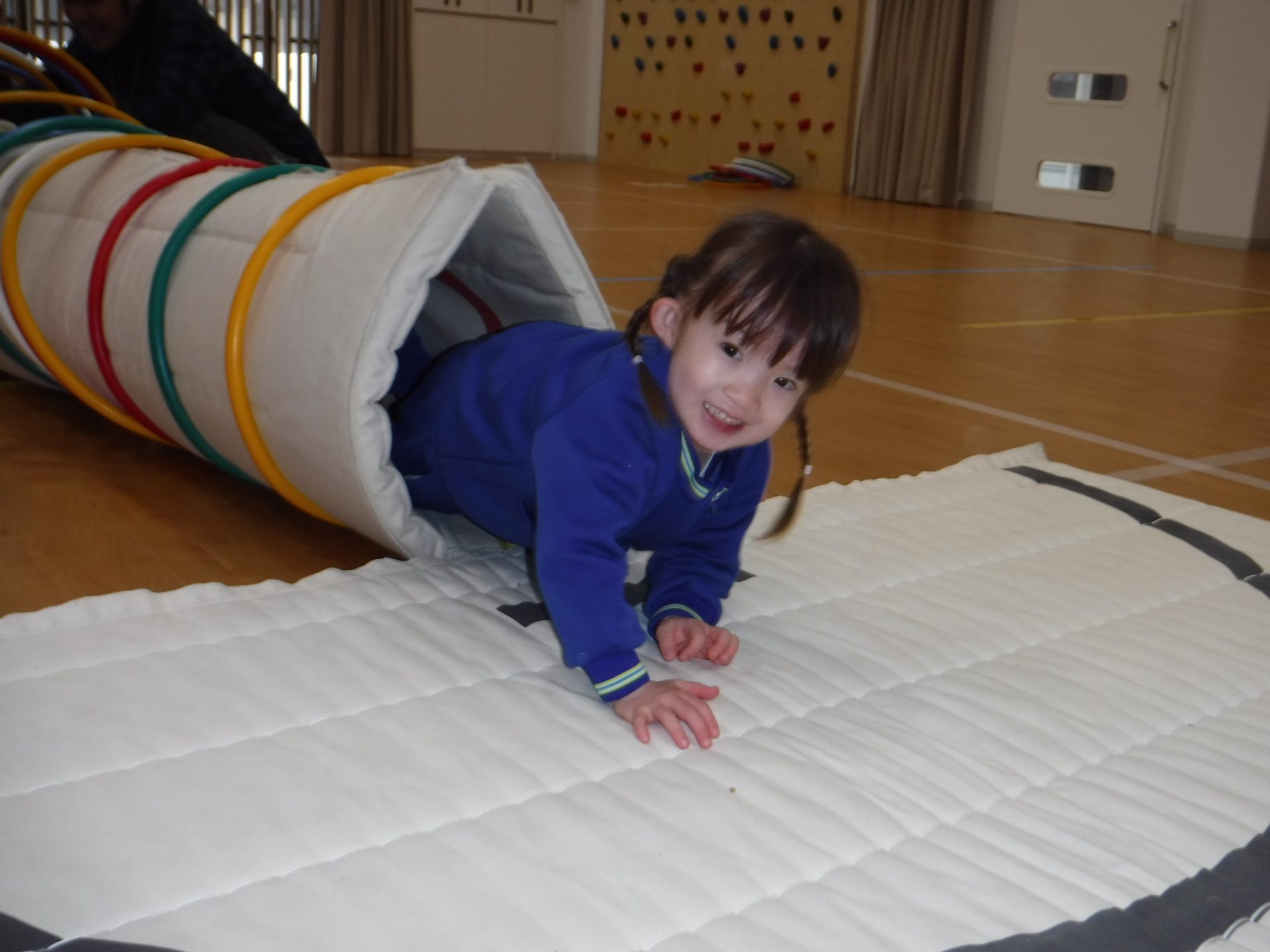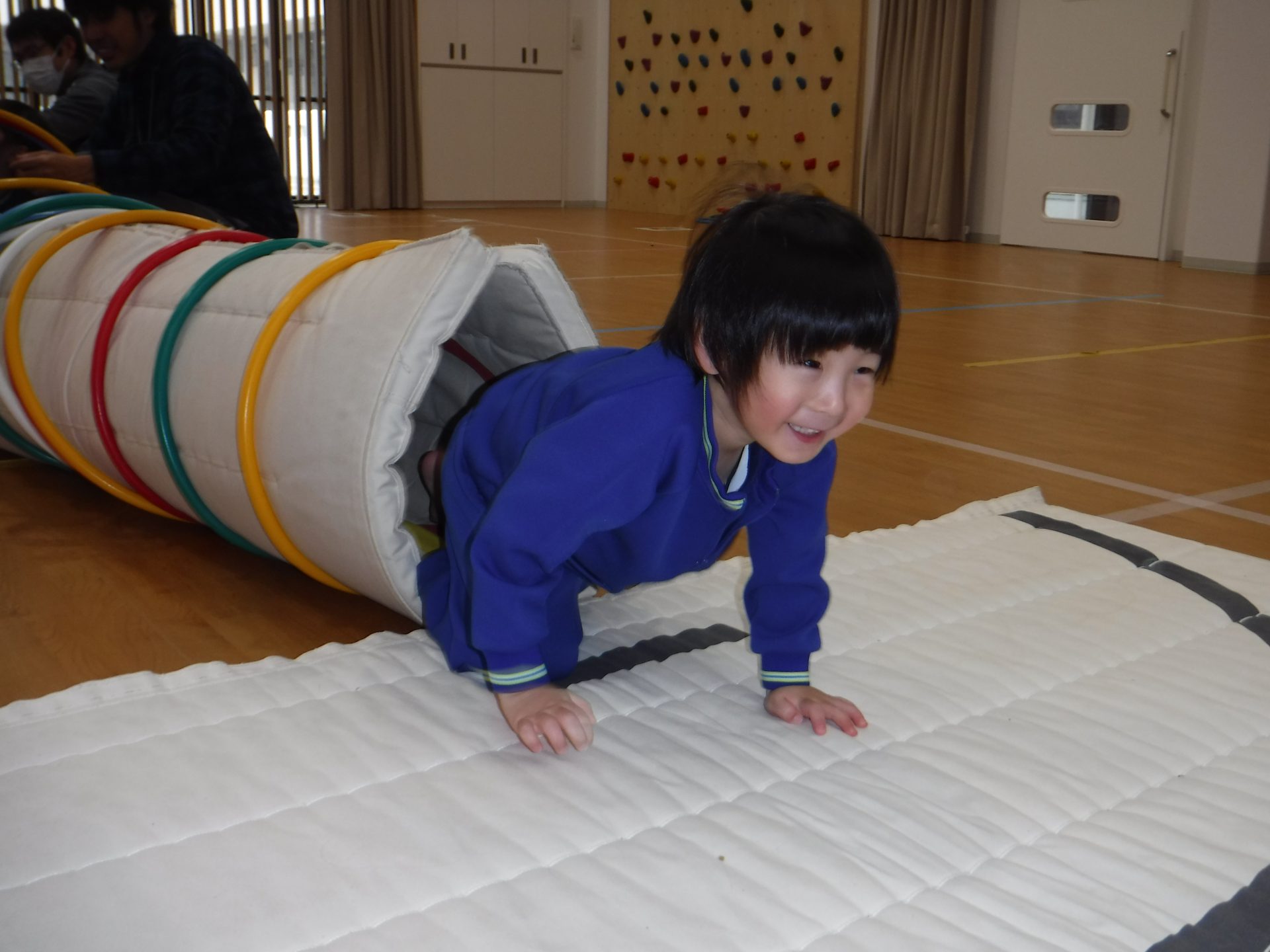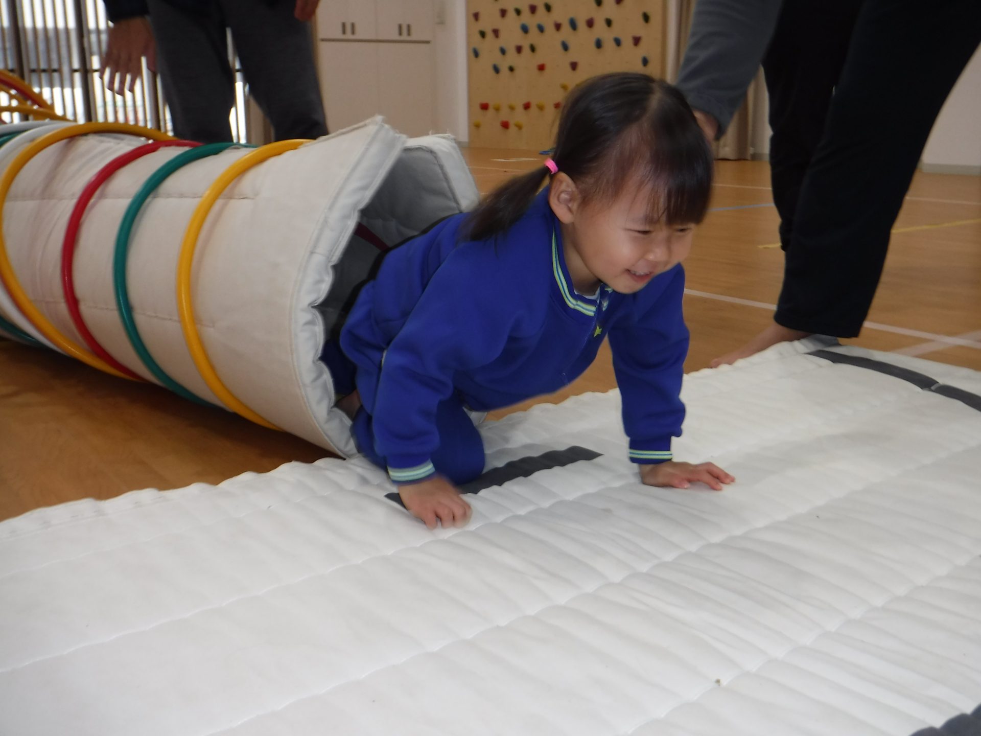 一人一つフープをもらい、回したり転がしたり、自由に遊びます。