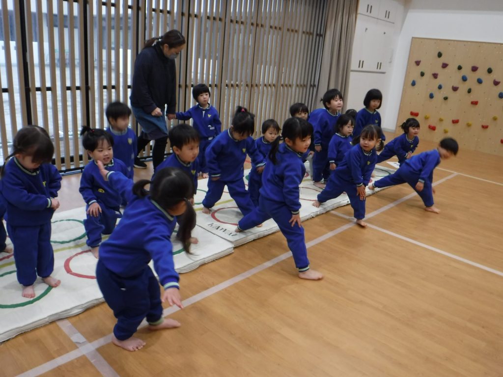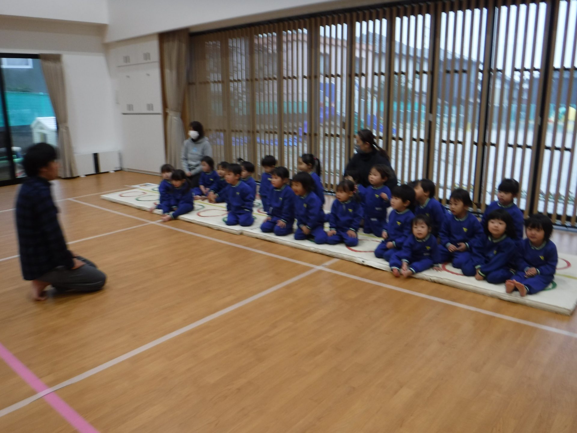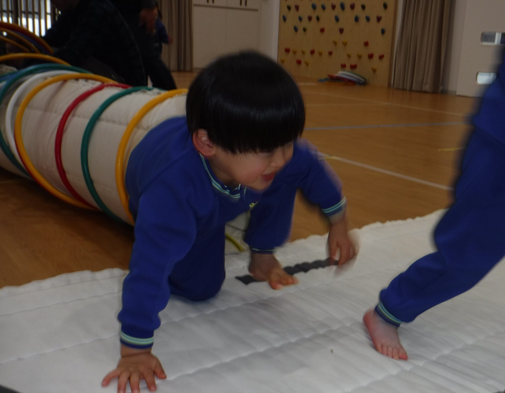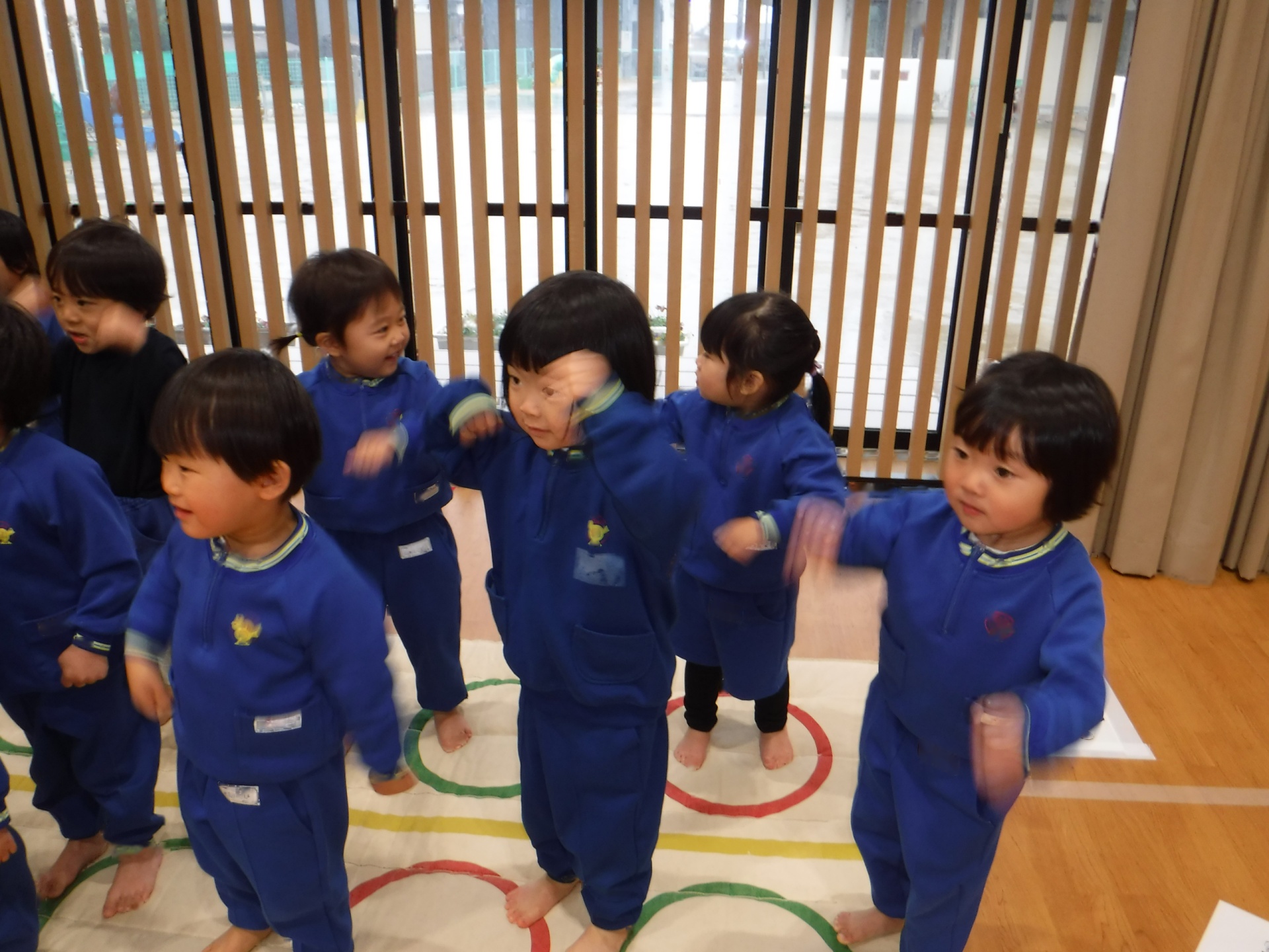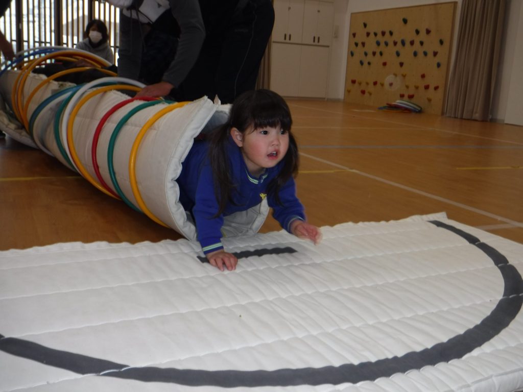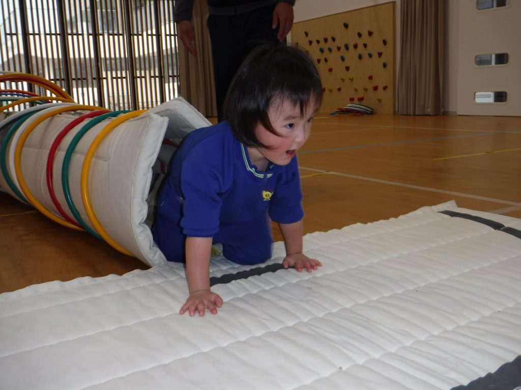一人一つフープをもらい、回したり転がしたり、自由に遊びます。