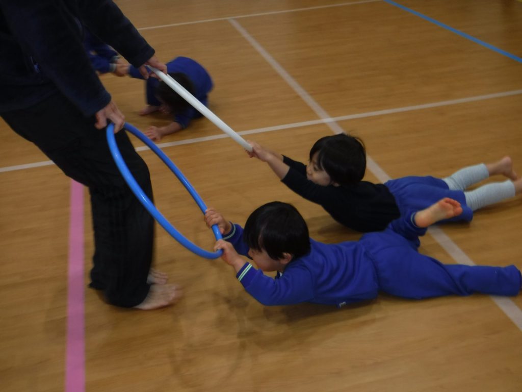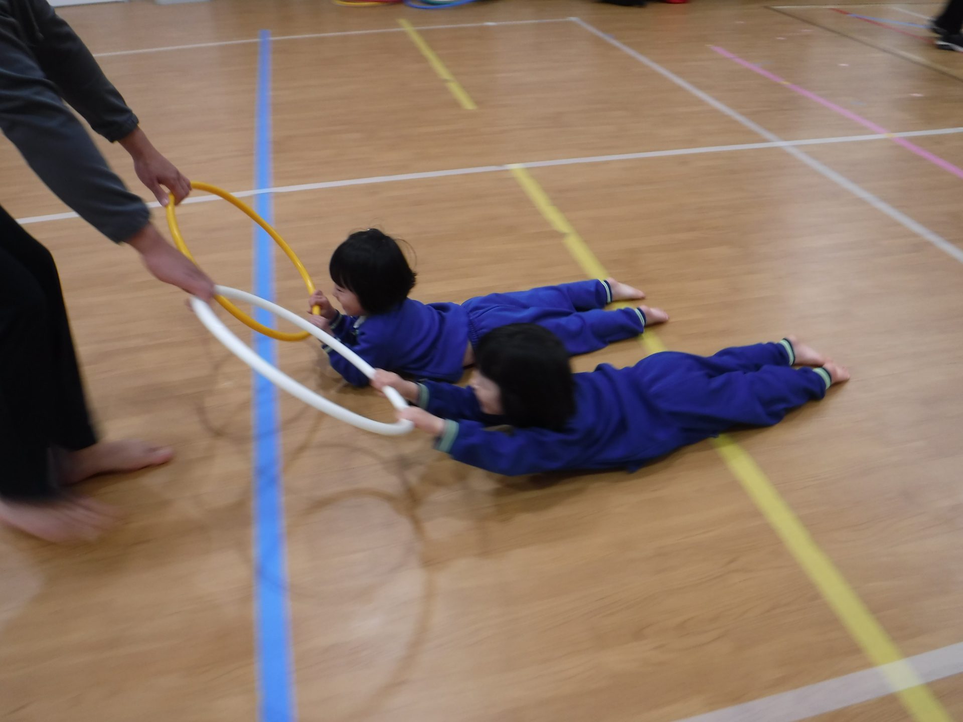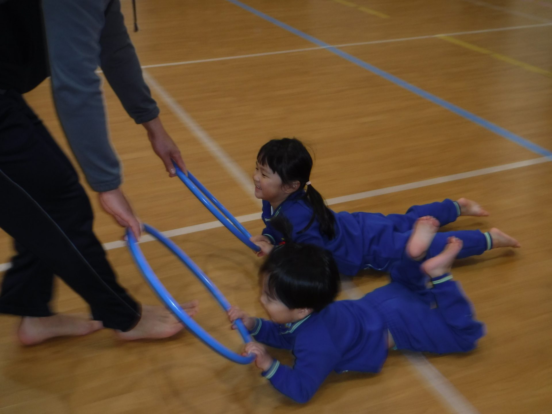 フープを持って寝転んで…離さないようしっかり握ってね!