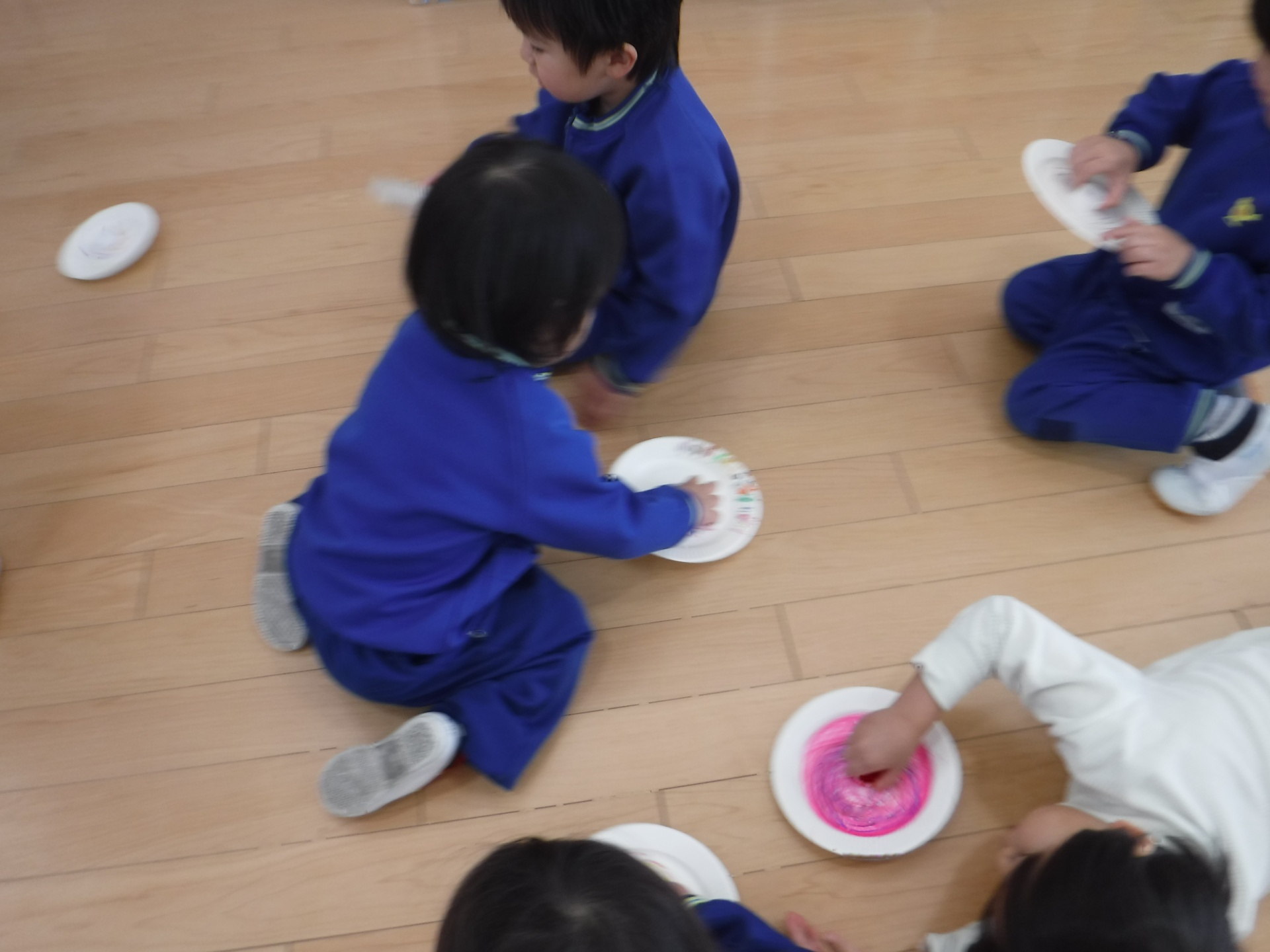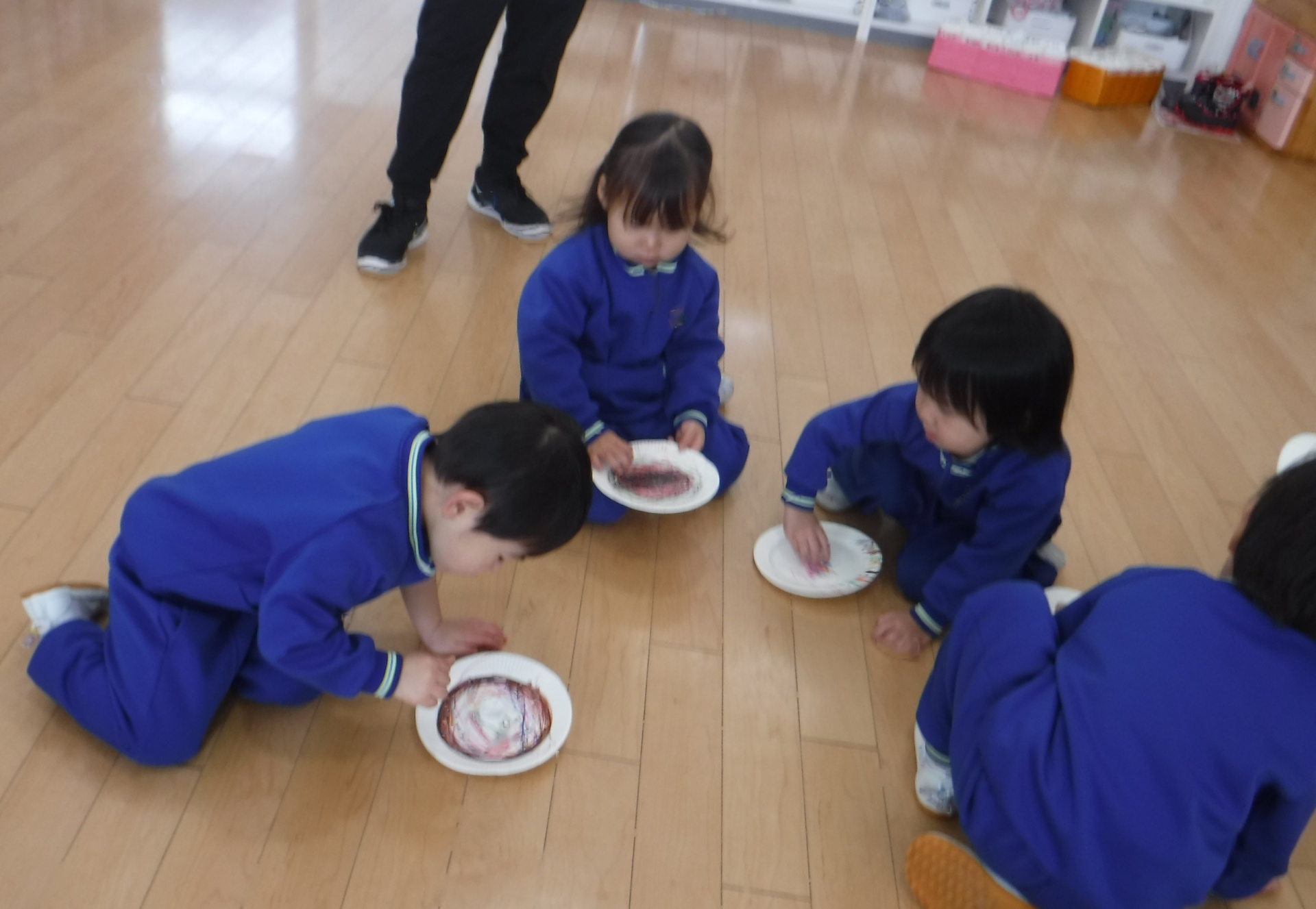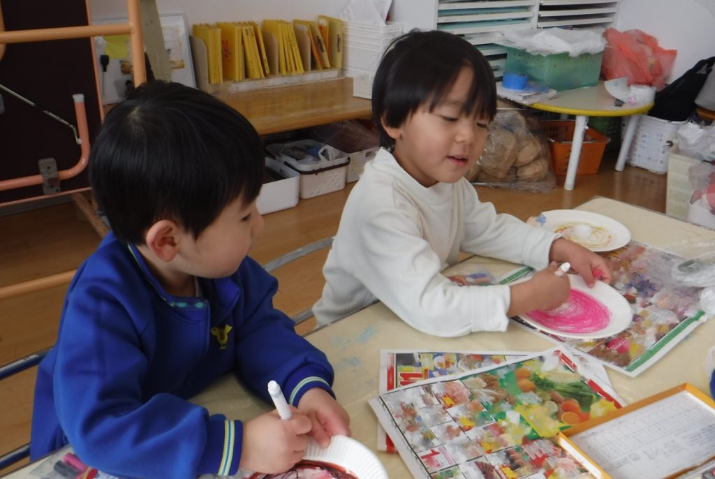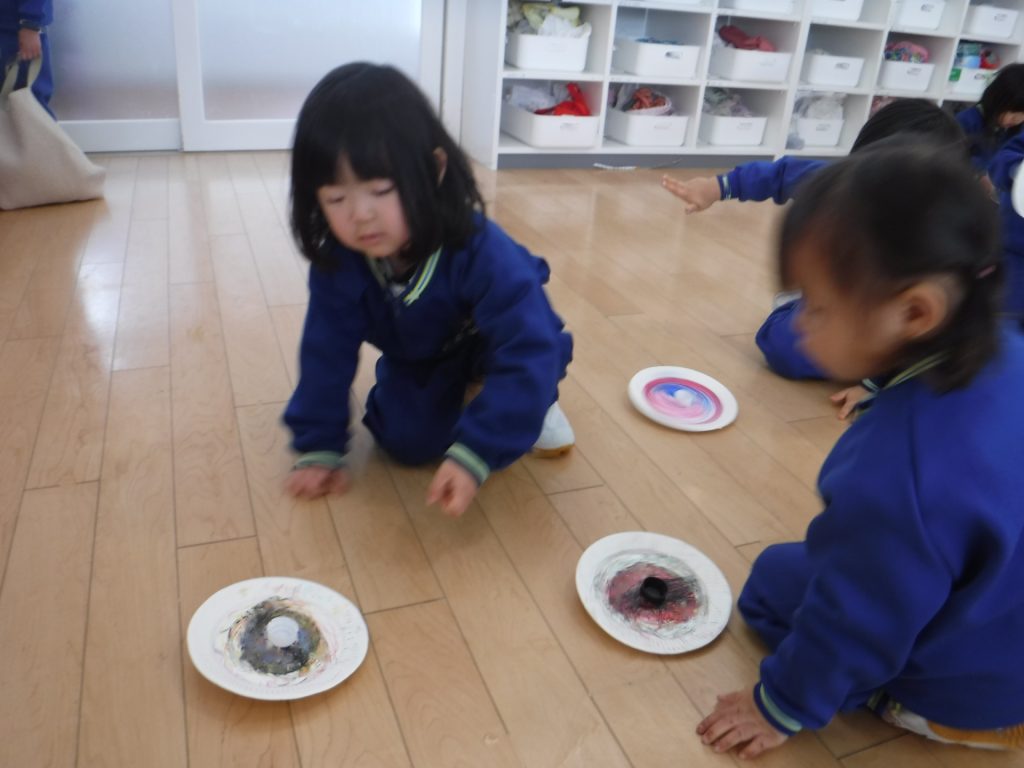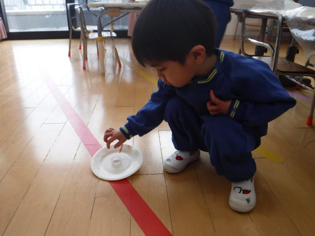 お部屋に戻って、紙皿でコマ作り!
