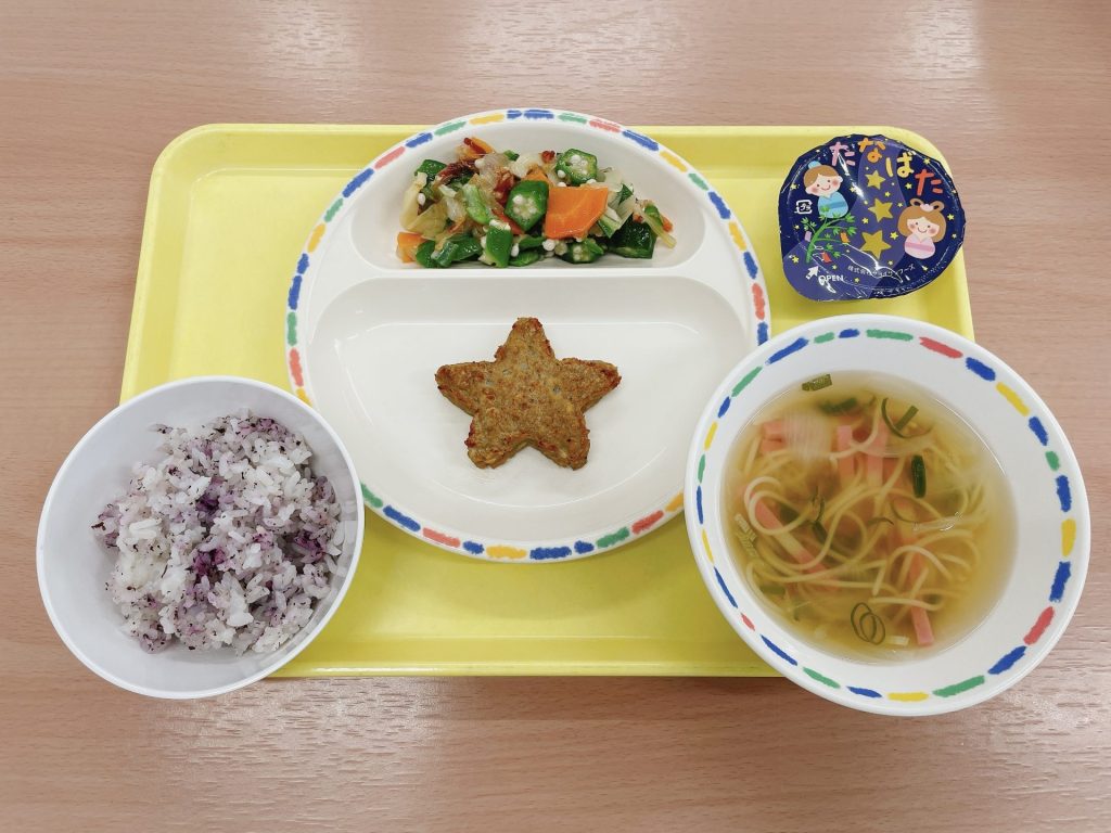 七夕メニュー:七夕が近いので、お星さまの形のオクラを使った和え物と、ハンバーグとゼリー、天の川をイメージしたすまし汁です🎋💫