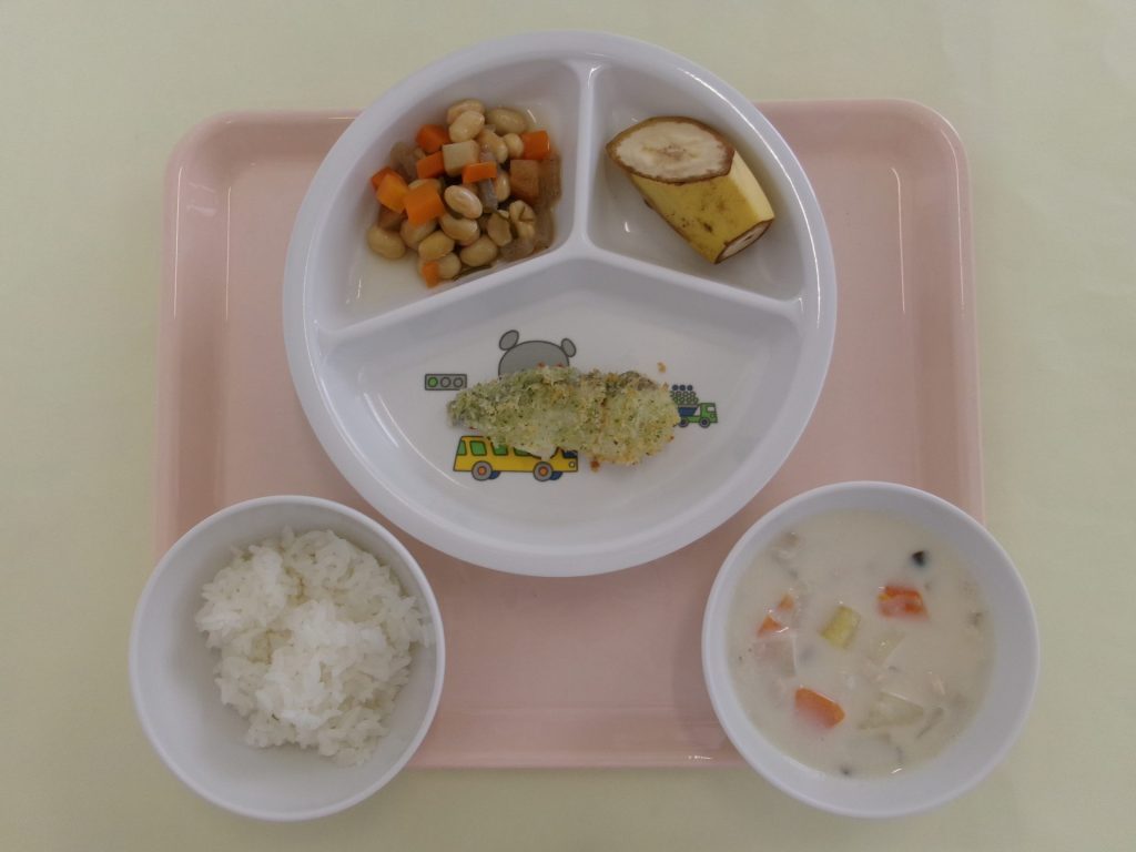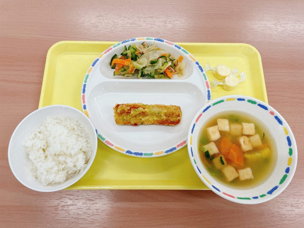 よい歯の日メニュー:今日はよい歯の日なので、噛みごたえのあるちくわの磯辺揚げ、カルシウムたっぷりのチーズです🦷☆