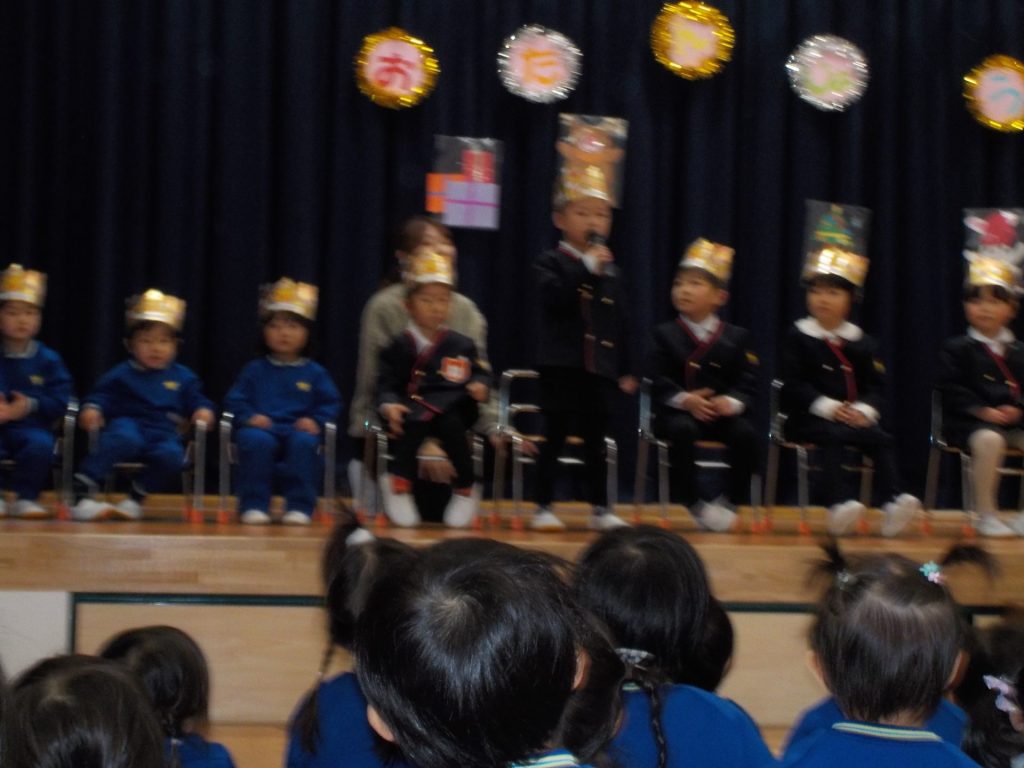14人のお友達が入場したら、まずは自己紹介。ちょっと恥ずかしかったお友達も、クラスのお友達に手伝ってもらって、クラス、自分のお名前、何歳になったかを発表します。