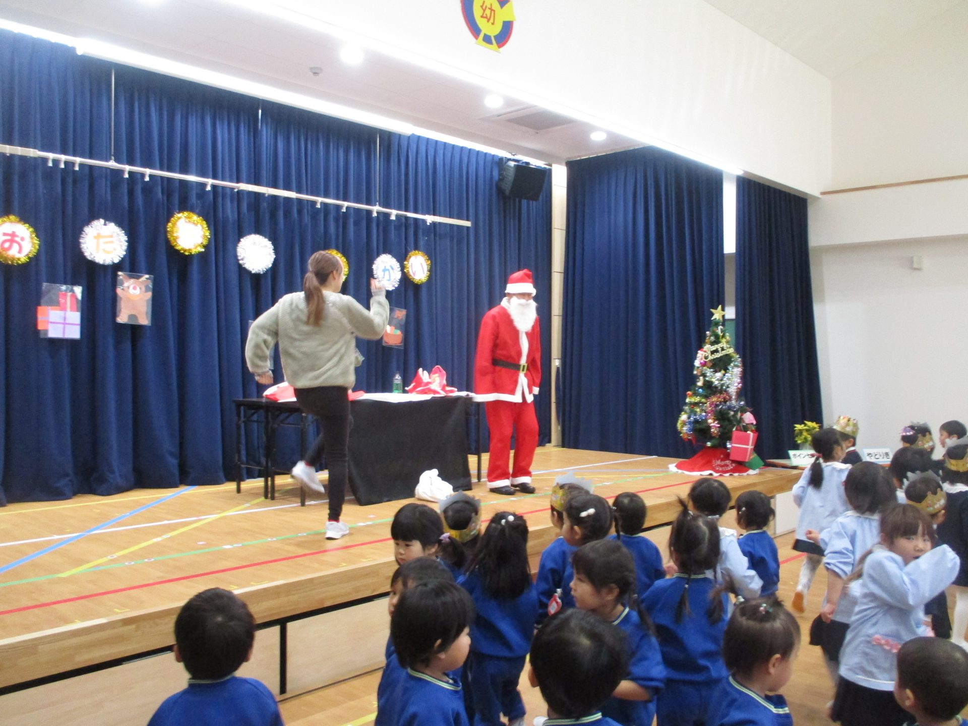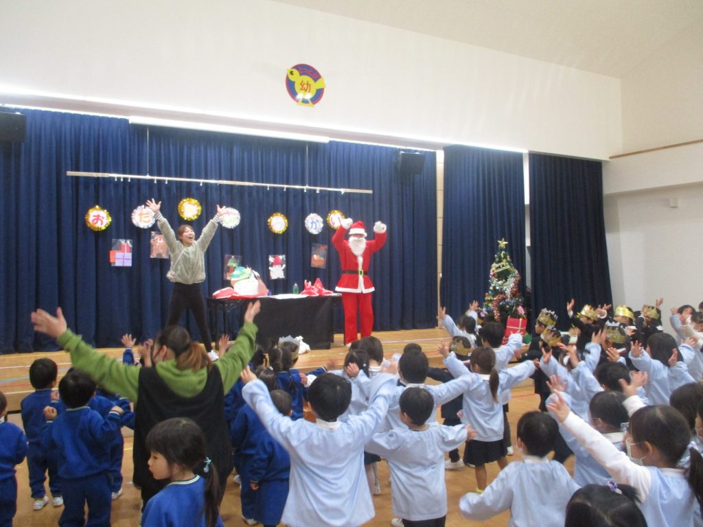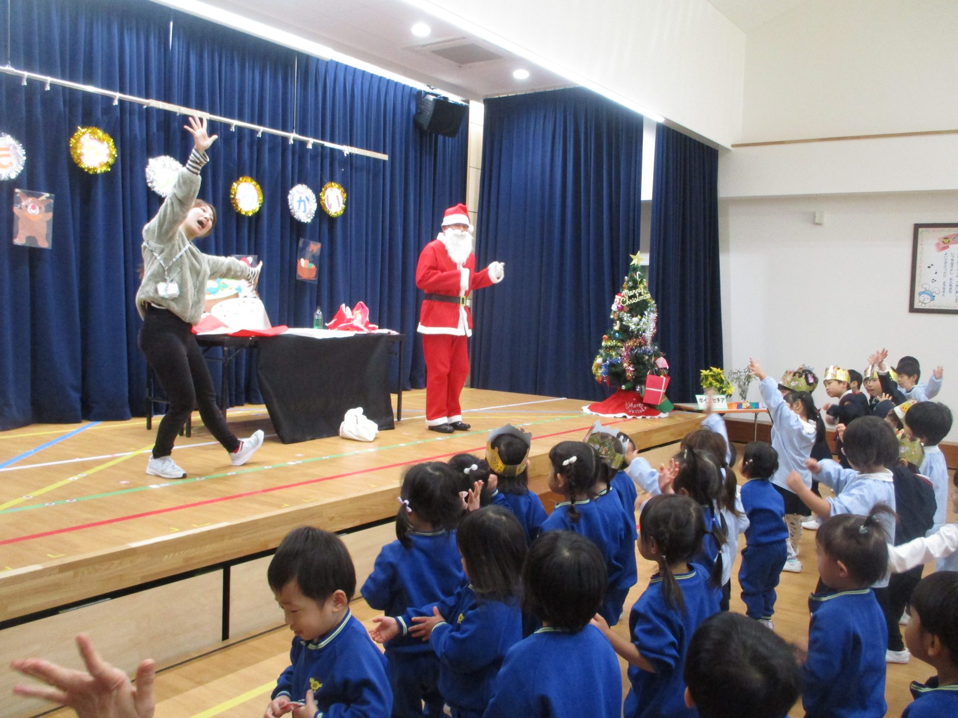 プレゼントのお礼に、サンタさんと一緒に「あわてんぼうのサンタクロース」でダンスをしました。サンタさんもノリノリでダンスしています。
