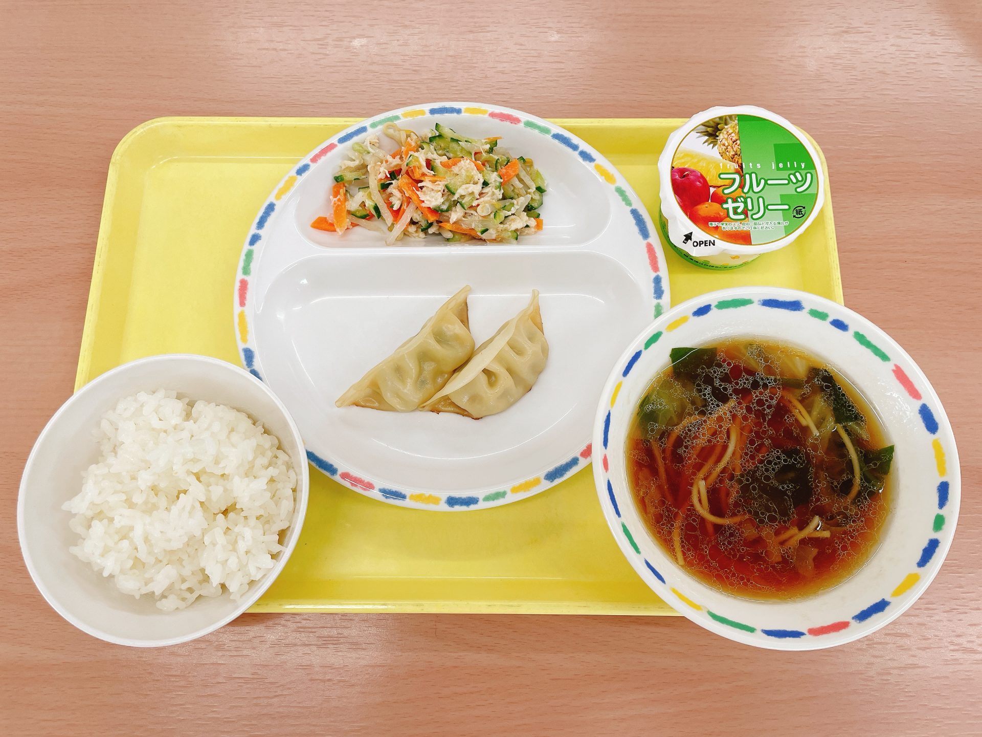 5園リクエストメニュー:今日は5園さんのリクエストメニューで、ぎょうざ、ラーメン、バンバンジー、果物ゼリーがリクエストでした☆