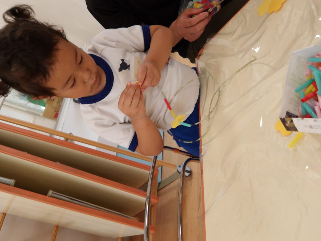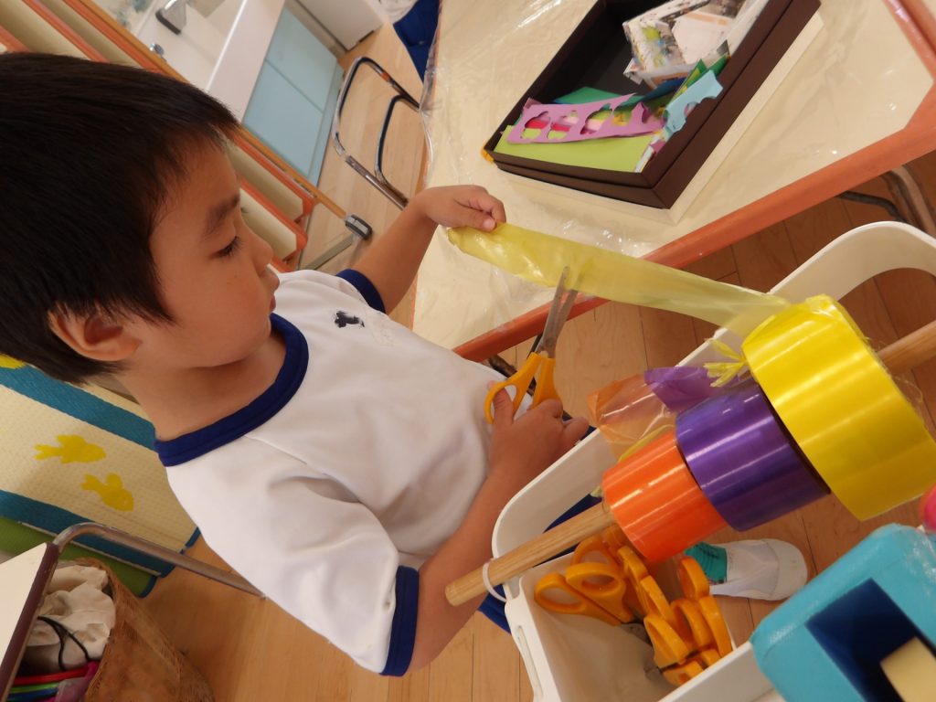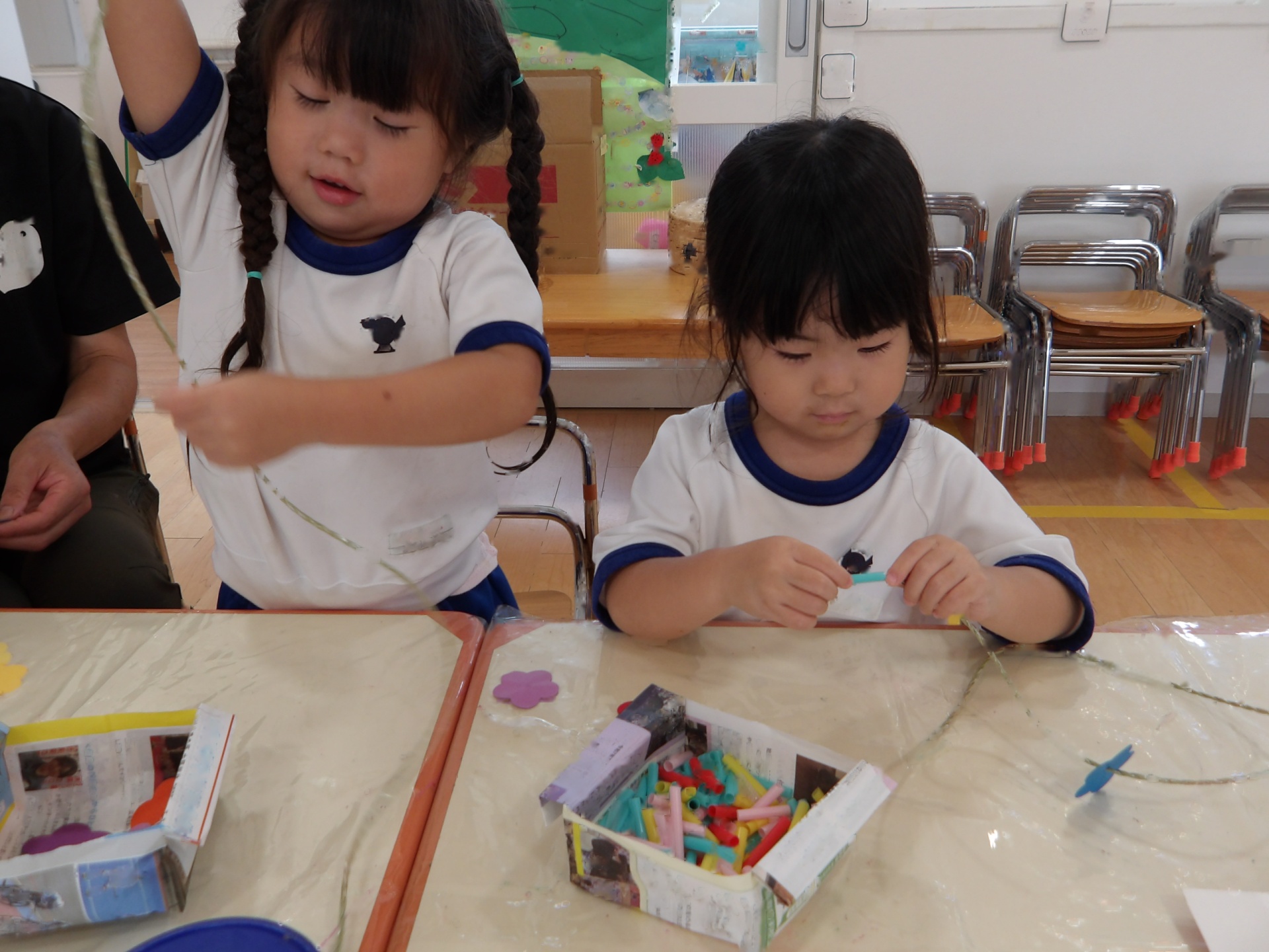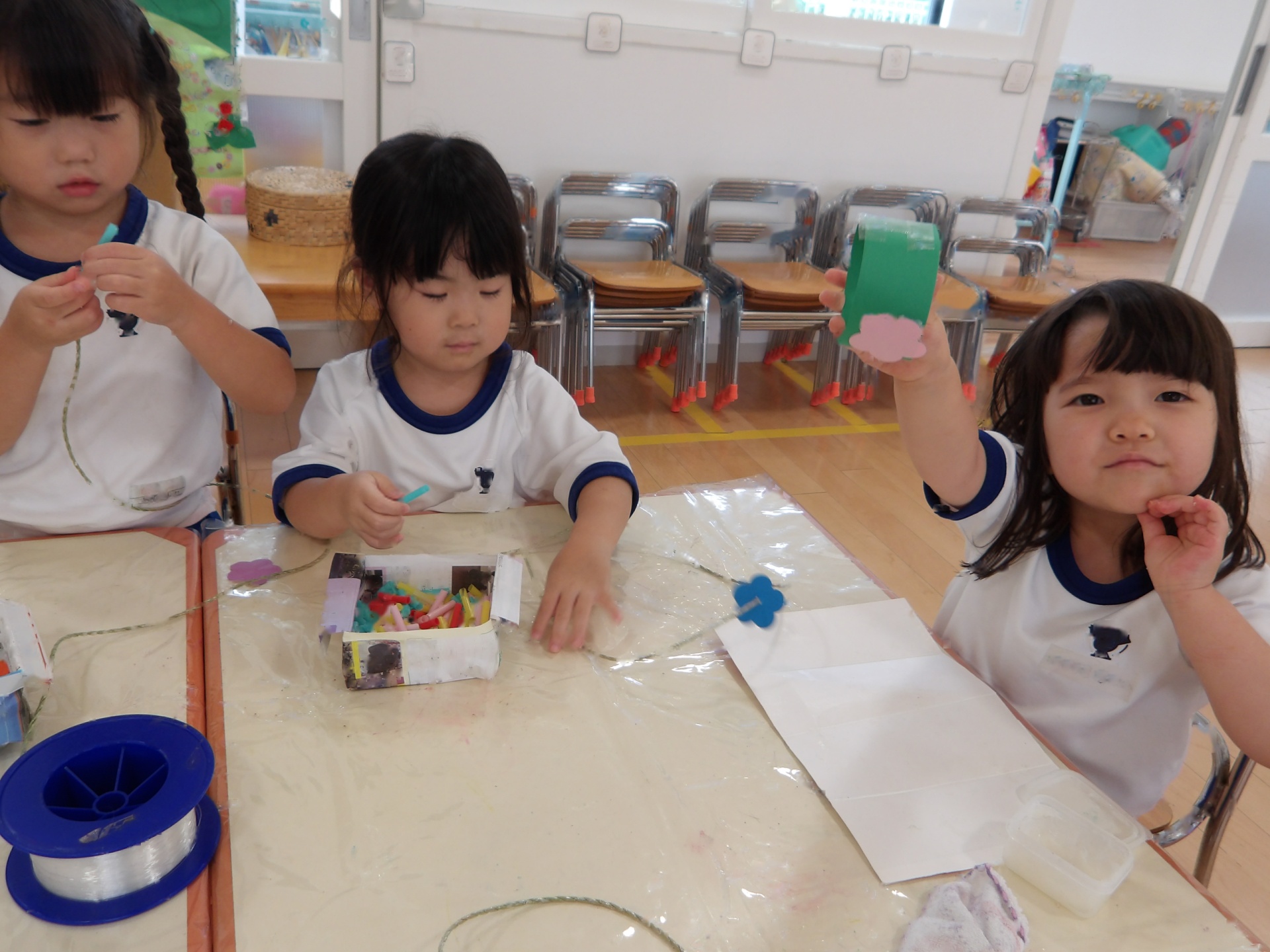 7月に盛り上がっていた工作コーナーは、更に盛り上がりを見せています。お金作りに引き続き、アクセサリー作りなども始まりました。今はハサミとのりを使って「木」を作っています。