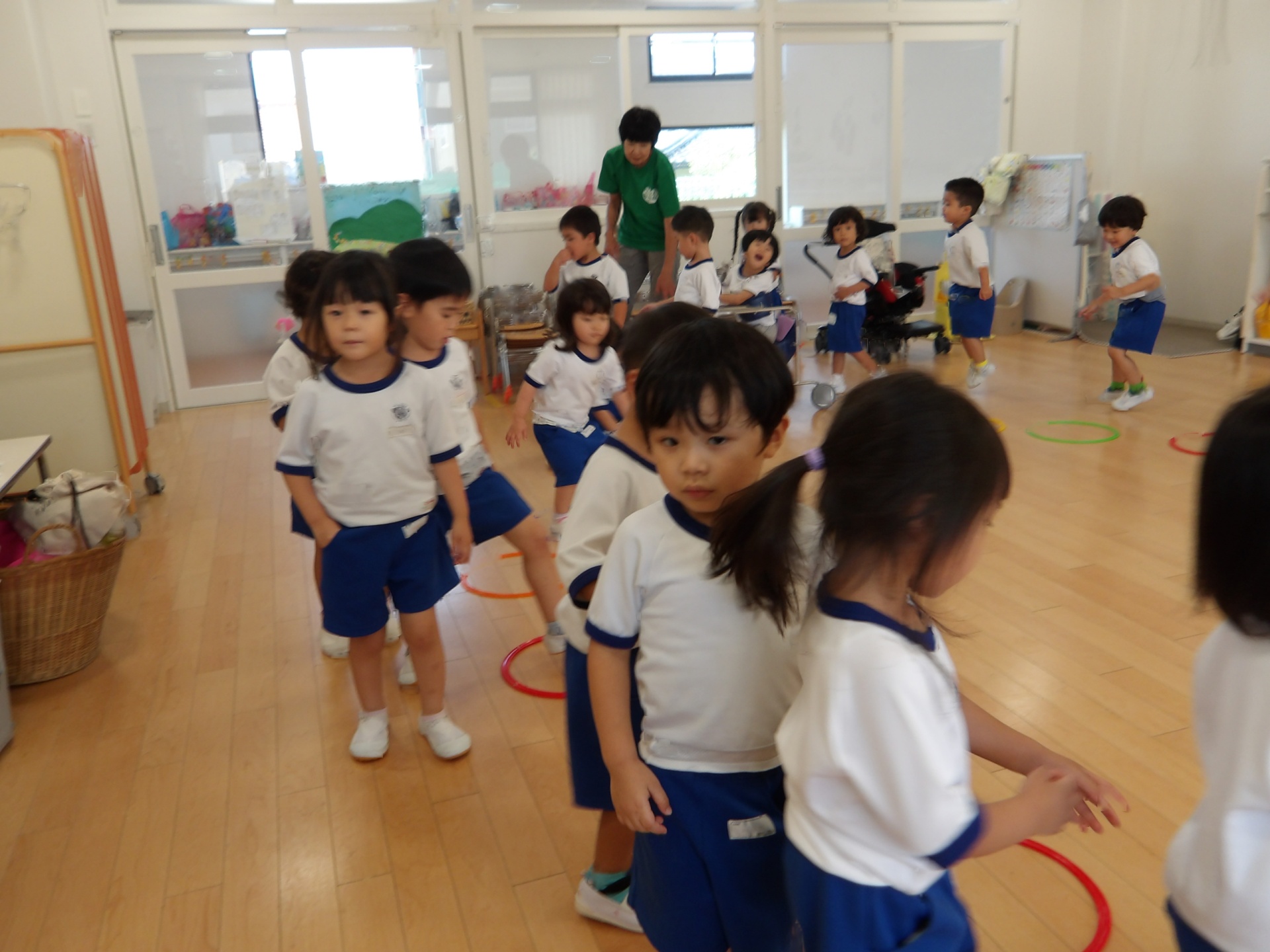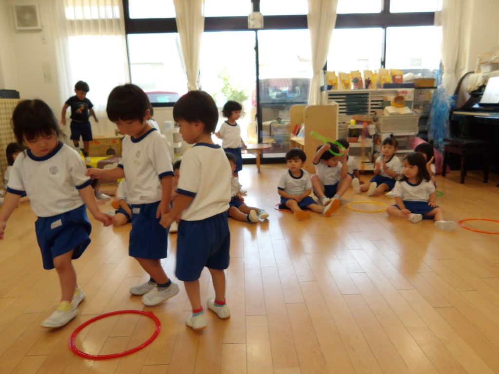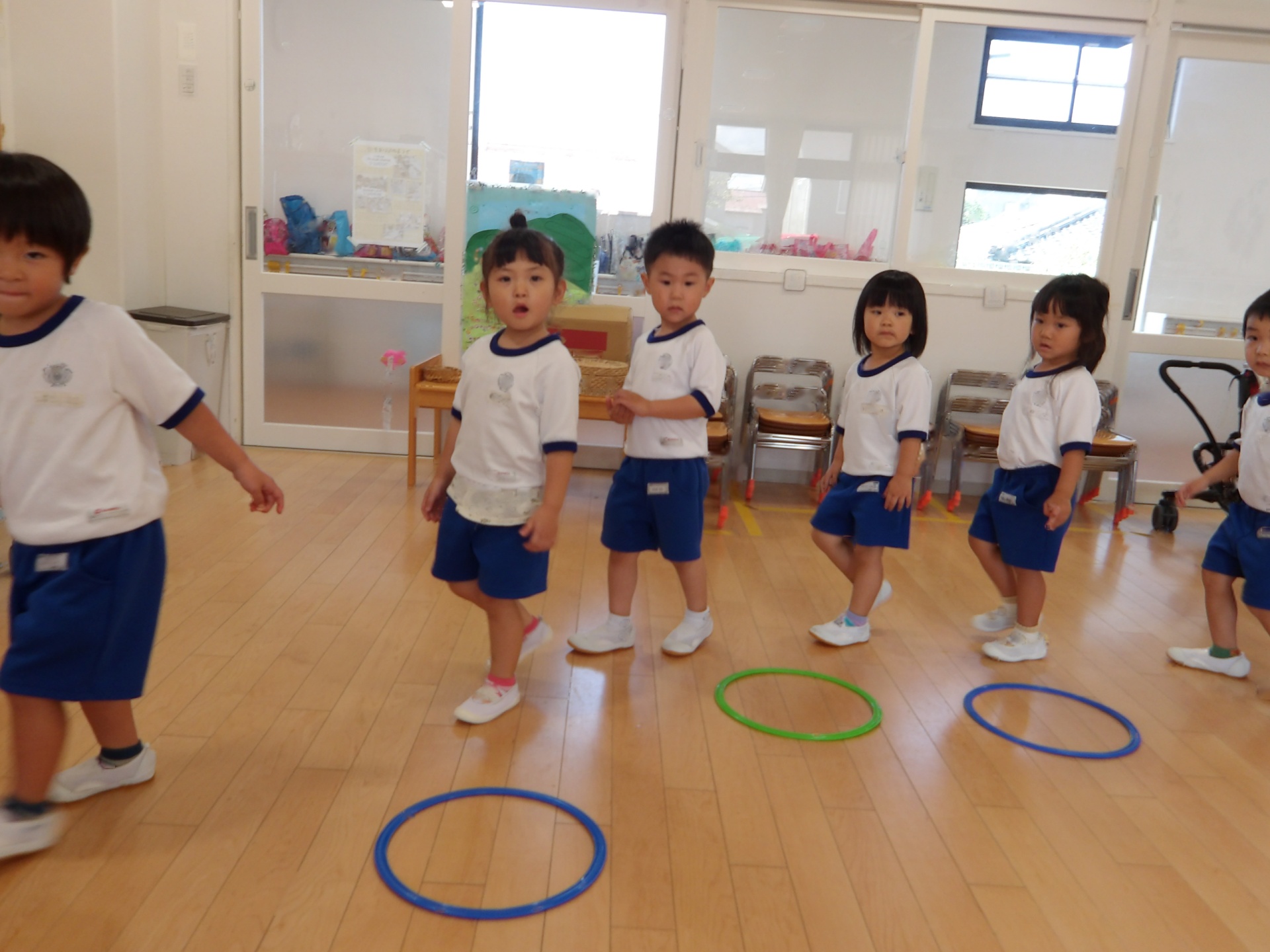 みんなで椅子取りゲーム こあら組ではフープを使って楽しんでいます。ルールを守れるようになると、いろいろな遊びができて楽しいね。