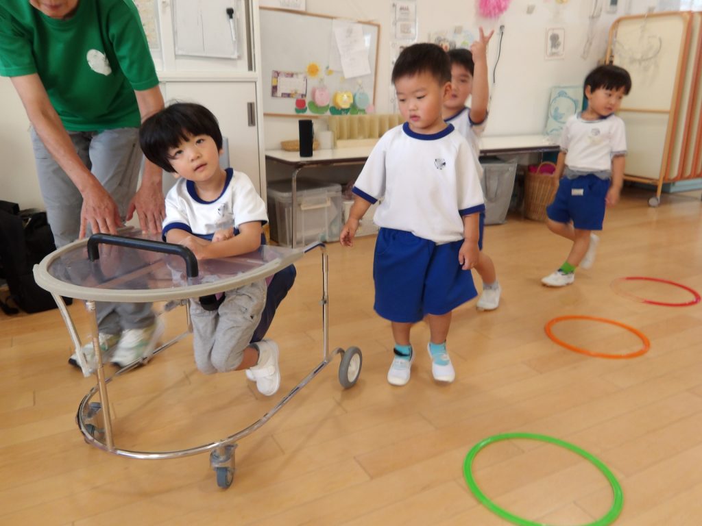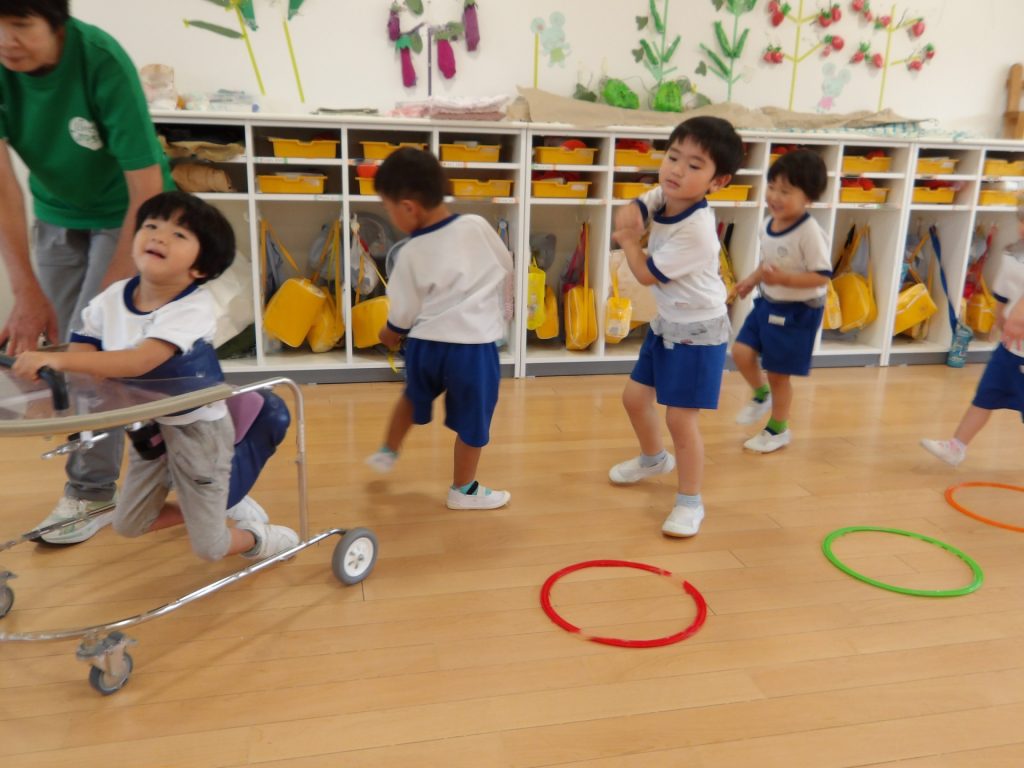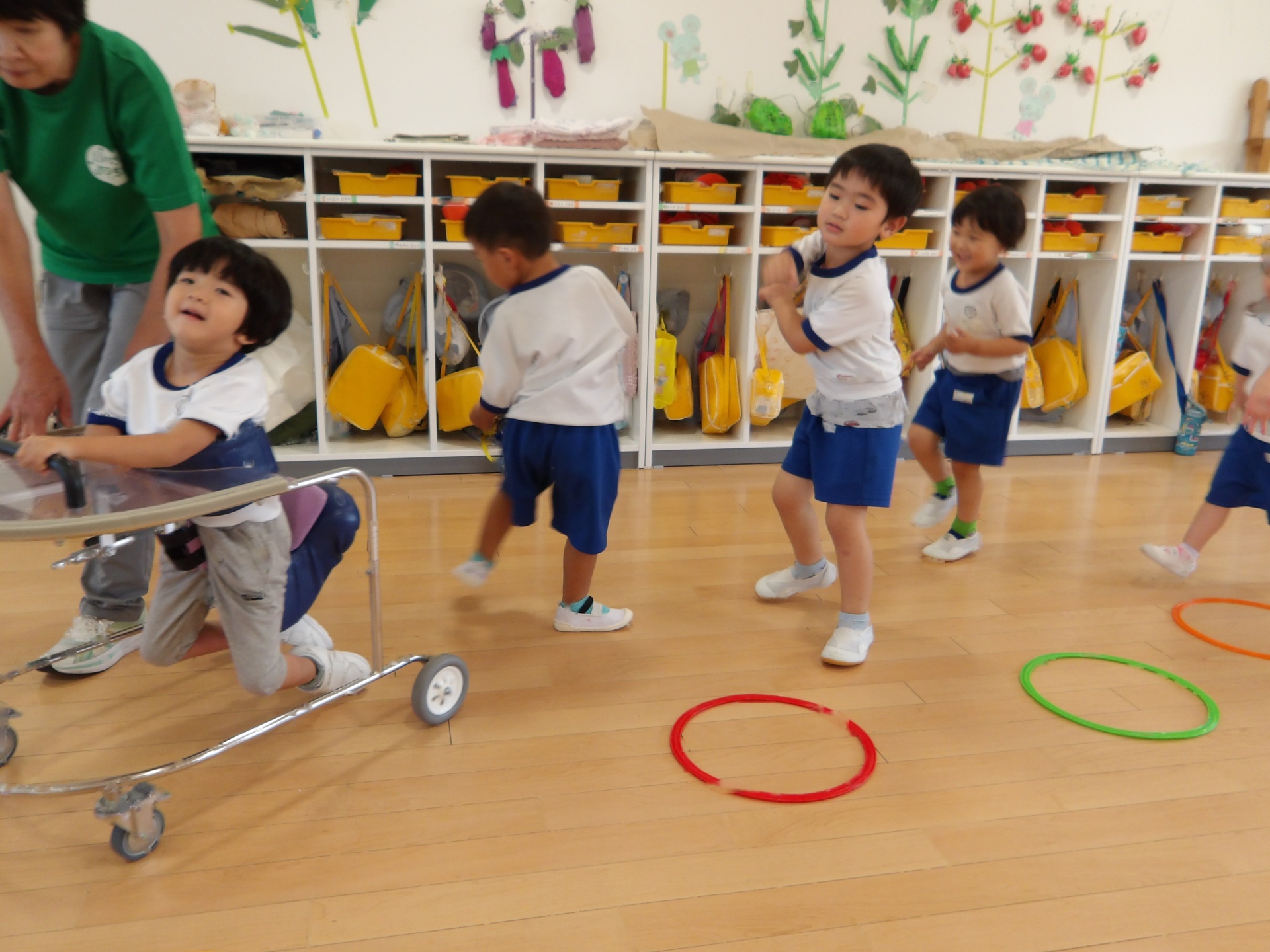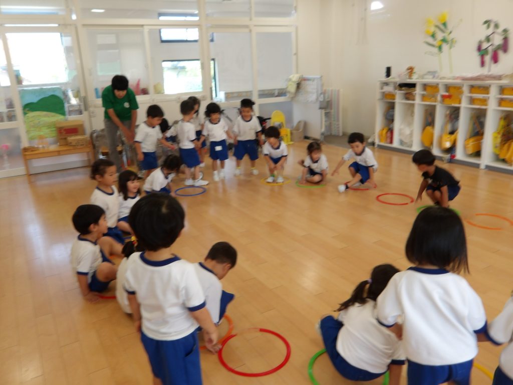みんなで椅子取りゲーム こあら組ではフープを使って楽しんでいます。ルールを守れるようになると、いろいろな遊びができて楽しいね。
