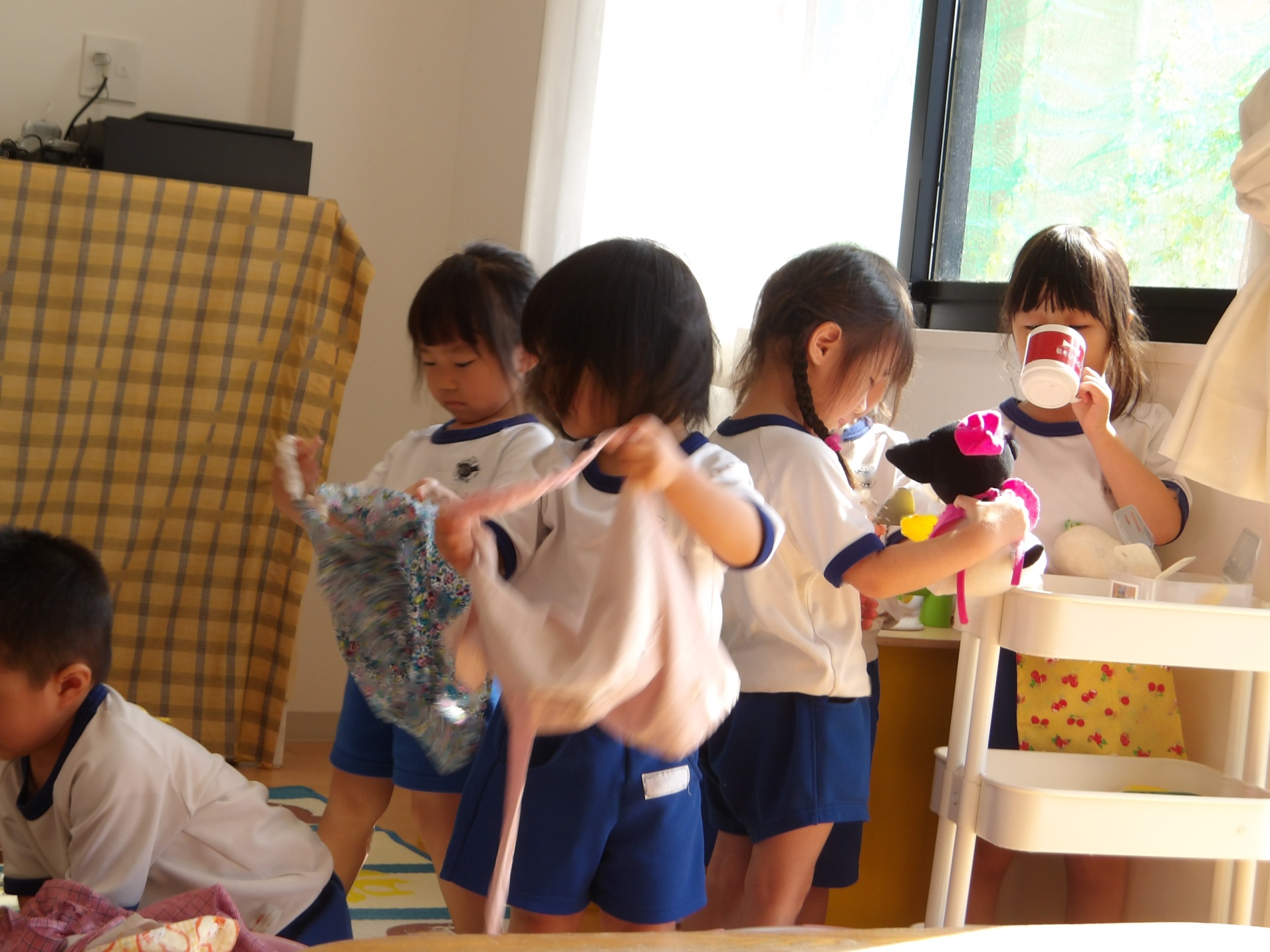 「〇〇ちゃん、ごはんだよ~。」「はい、だっこしましょうね。」いろいろな言葉が聞こえてきます。エプロンも自分でつけようと頑張っています。