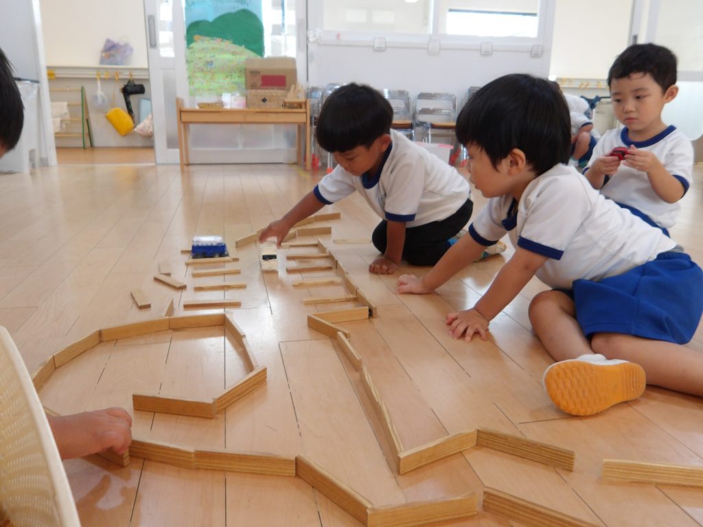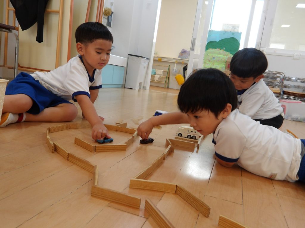 車あそびもまだまだ大好きです。「カプラ」という積み木を使って、駐車場や道路も作っていきますよ。