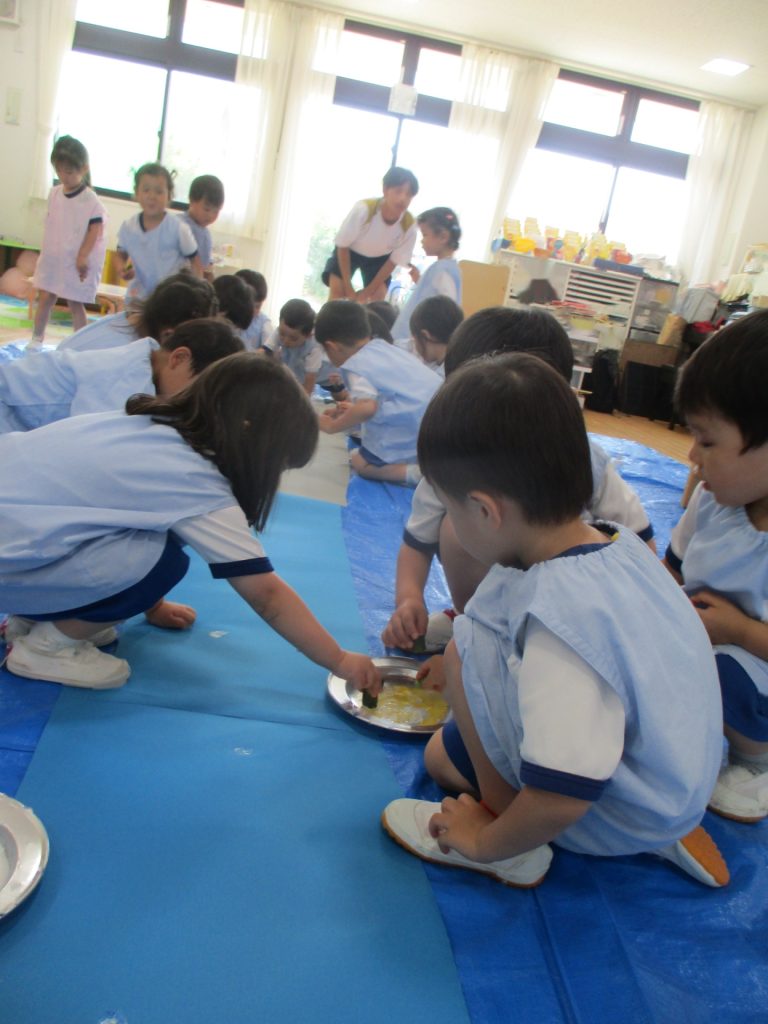 最後は一人一枚画用紙に天の川を作りました。写真に収められていないのですが、夢中になってくるとオクラを滑らせて流れ星のような模様を描くお友達もいました!大人にはないアイデアに感心させられてしまいました。