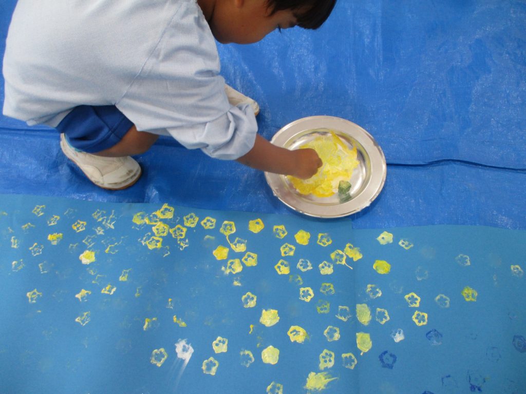 オクラはスタンプにすると、こんなにきれいなお星さまができますよ。先日作った織姫と彦星のデート場所に、天の川を作ることとなりました。オクラは生のお野菜なので、やわらかいです。押す力が強くなり過ぎないように注意しながら、丁寧に押していきます。「お星さまになった♡」と嬉しそうです。
